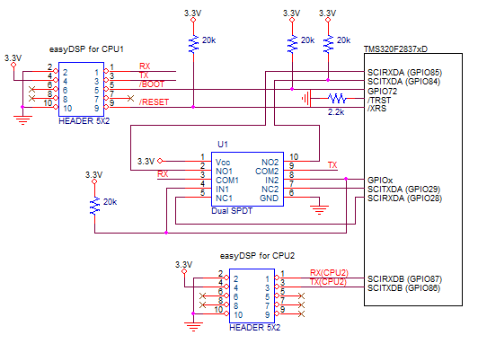 결선을 바꾸기 위해 부가적인 GPIOx가 할당되었습니다. 사용하지 않는 GPIO중 하나를 본 용도로 할당해 주십시오. 리셋 이후 부팅 동작 동안은 GPIOx가 입력단자(리셋 초기값)이므로 외부 풀업 저항에 의해 dual SPDT의 IN단자에 1이 입력되어 easyDSP 결선은 GPIO85/84에 연결됩니다. 이후 부팅을 완료한 후 사용자 프로그램에서 GPIOx를 출력단자로 설정하시고 값을 0으로 변경하여 easyDSP 결선을 다른 포트(회로에서는 GPIO28/29)로 할당하는 원리입니다.
