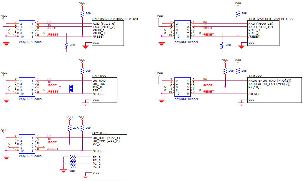 LPC1800의 경우, 부트 모드가 부트 핀에 의해 결정되도록 MCU가 설정되어야 합니다. 즉, OTP 메모리가 프로그램되어 있지 않거나, OTP BOOT_SRC bits이 모두 0이어야 합니다 (출하 기준 기본값).기타 주의 사항 : easyDSP 헤더 RX, TX 신호는 easyDSP 포드 내부에서 100k 오옴으로 풀업