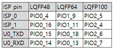 LPC1500의 경우 MCU 패키지에 따른 핀에 대해서 하기 테이블 참조하세요.![]()