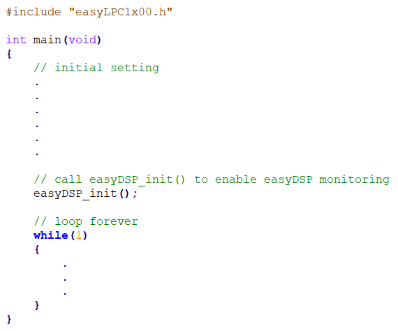 먼저 main.c 상단에 easyLPC1x00_va.b.h를 include하여 주시고, main 함수 초기화 루틴 이후 easyDSP_init() 함수를 호출하시기 바랍니다.