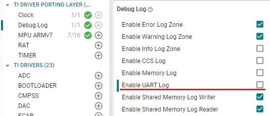 easyDSP는 MCU와 통신시 UART0을 사용하므로, Debug Log > Enable UART Log를 비활성화거나, 사용이 필요할 경우 UART0이 아닌 다른 곳으로 설정합니다.