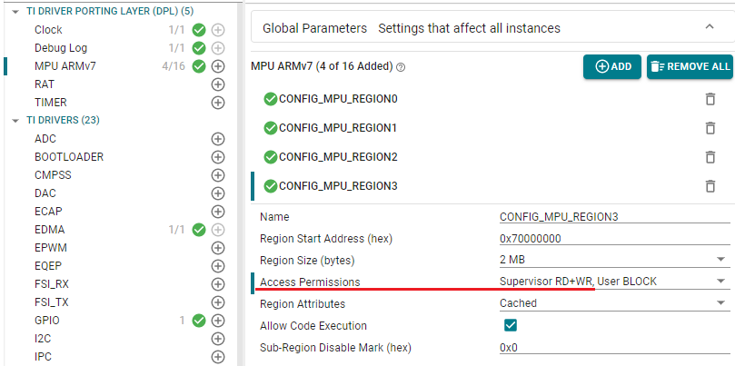 easyDSP가 모니터링을 수행하는 모든 코어에서 (core a, b, e, f, g, h, i) 변수가 위치한 메모리 영역을 easyDSP가 읽고 쓸 수 있도록 해당 메모리 영역을 Supervion RD+WR으로 설정합니다 (User 설정은 상관없음).