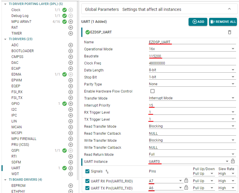 easyDSP Pod가 연결된 코어 (STEP1의 노란색 코어)에 대해서 UART 관련 설정을 하기와 같이 수행합니다.