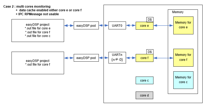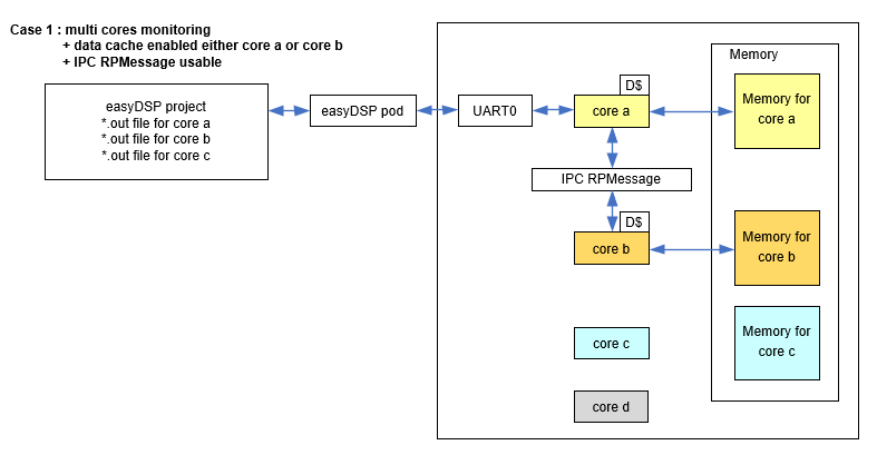 Case 1 :본 경우는 easyDSP가 여러 코어 (core a, b)에 대해 모니터링을 수행하며, 그 중 데이타 캐시를 사용하는 코어가 하나라도 있고, IPC RPMessage를 사용할 수 있는 경우입니다.
