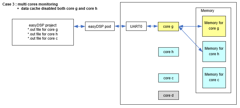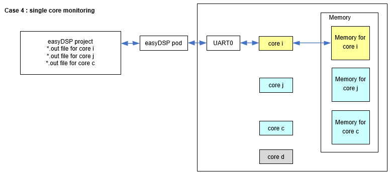 easyDSP pod는 UART0을 거쳐 core a에 연결되며, core a 변수가 저장된 메모리는 core a가 억세스합니다.
