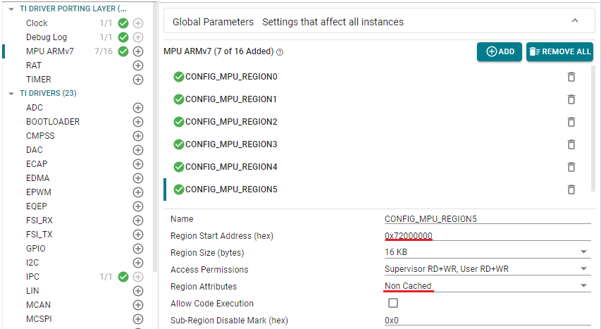 또한 IPC RPMessage 사용시 공유 버퍼로 사용되는 메모리 영역 (0x72000000) 의 Non Cached 설정이 필요합니다.