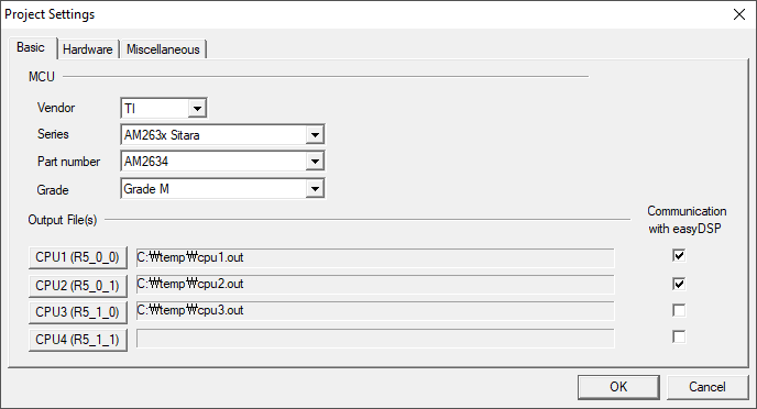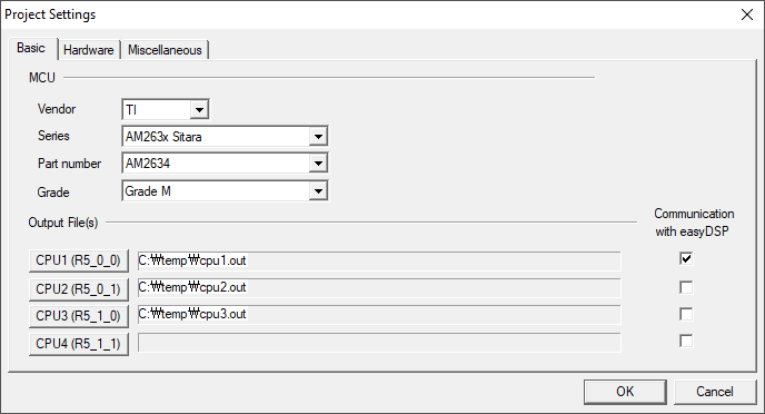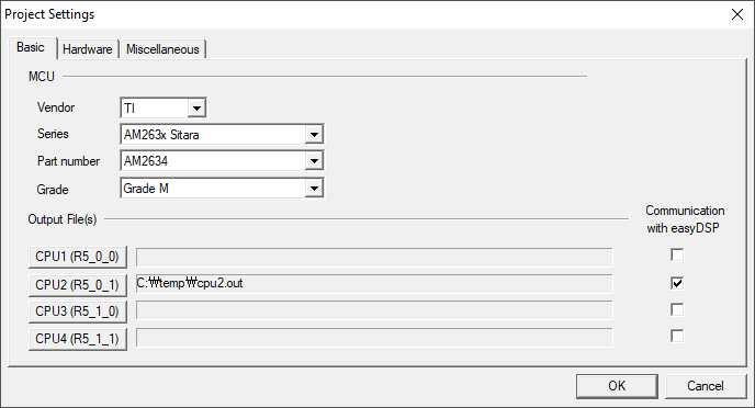 easyDSP와 통신하는 코어로 CPU1, CPU2를 선정하며, 실제 동작하는 모든 코어의 출력 파일을 등록합니다.![]()